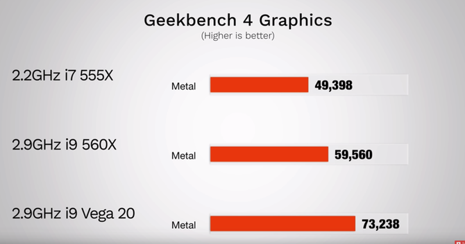 (图片截取自AppleInsider的Youtube视频 下同) 在Geekbench 4 OpenCL测试模式下,Vega 20带来的性能提升可以说是相当惊人,拿到71,937的超高分数,也几乎比560X快要多出 20,000分,单凭这项测试你大概就能了解这新显卡的性能有多强大。