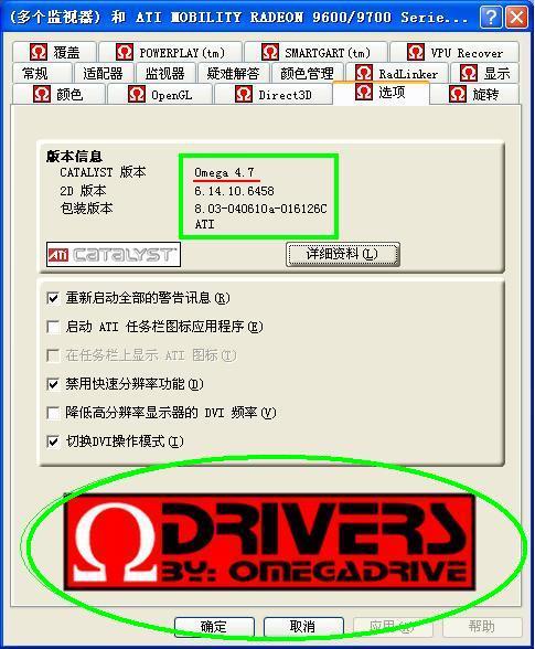 将下载下来的驱动解压缩后安装,在安装完ati tools等一系列软件后会提示你安装ATI RADEON OMEGA DRIVERS,全部安装完后重启。
