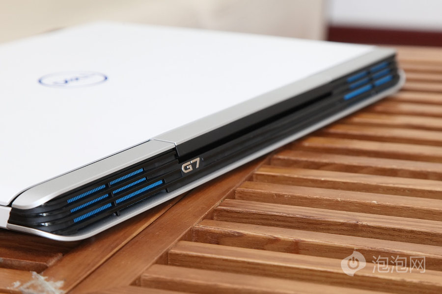 戴尔G7游戏本在外观的设计上非常值得称赞,笔记本后方通常为散热系统的出风口区域,这款笔记本在出风口区域增加了蓝色格栅,与A面logo与C面面板相互呼应,另外,在后方的左下方,还配有“G7”的金属名牌,提升辨识度。