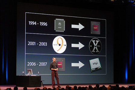 据透露,2006年苹果转向Intel后推出的首款机型将采用Pentium M处理器。苹果和Intel的发言人都没有对此发表任何评论。很难令人想象,早在五年前,苹果CEO Steve Jobs就已经在安排转向使用Intel芯片的计划了;但Jobs当时也仅把它看作是应急计划,用以应对与IBM以及Freescale半导体合作出现困难时的局面。但事实确实发生了,苹果与IBM、Freescale发生了分歧,当年的后备计划成为了本周业界的焦点。在本周一美国旧金山举行的WWDC 2005会上,Jobs在发言中证实了明年苹果电脑将使用Intel处理器,结束了过去数周以来的种种猜测。