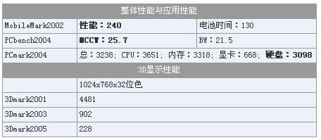 各项成绩的测试都在其硬件配置水平的相应性能上,只是在硬盘、内存、处理器的PCmark的检测中都有不错的成绩而在PCbench的BW测试中,只拿到21.5分有些偏低。而采用SATA接口的5400转8M缓存硬盘,性能的检测与采用IDE接口的同类盘没有差别。在Moibilemark的测试中,整体性能水平比较理想,因为采用四芯的电池,电池的可持续测试时间只能维持2个小时多一点时间,实际使用按正常的节能电池管理模式,使用时间一般在2.5-3小时之间,如果需要更长时间的使用,则需要选购六芯甚至更大容量的电池。