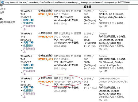 看到这里相信网友已看出名堂,前三款都比1BC便宜,但配置都比1BC高,除了19999元的2668CC2没有指纹识别之外,2668CC6、2668CC7均有指纹识别,质保也都是三年,其中ThinkPad T43 2668CC7的配置比1BC高了一大截,但报价却低了一千多元。不知是官网的疏忽还是联想另有安排,笔者前段时间发现官网上把几乎所有的ThinkPad内存参数都写错了,向他们反映了以后,到现在还没有完全改对。相信广大网友也是希望ThinkPad对他们认真一点,负责一点,如果连官网都作的都不够严谨的话,难说其产品愈走愈强。
