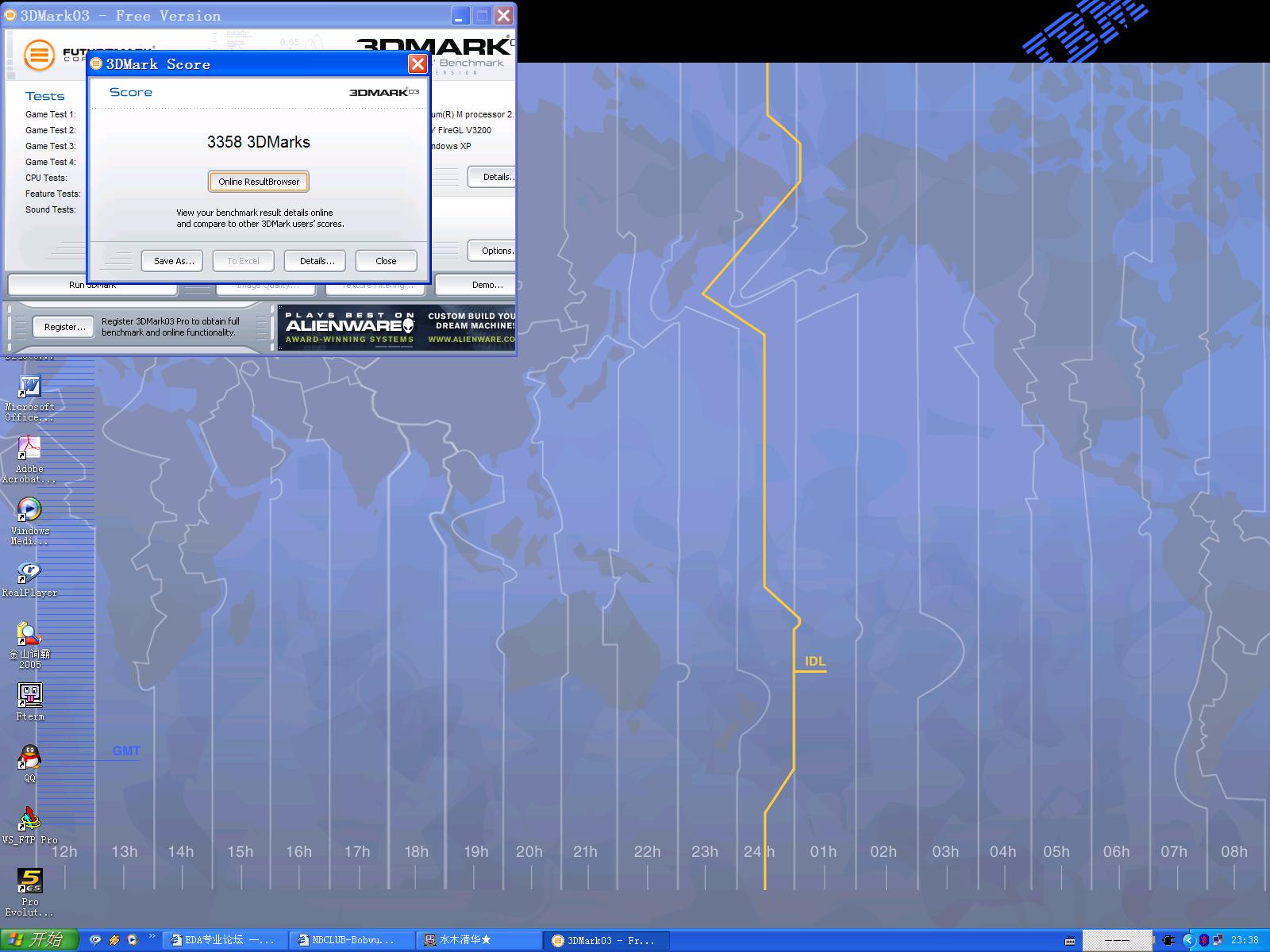 另外,本人曾经安装过ATI官方的5.08版本驱动,3dmark03的成绩能上到3389,不过在用一些eda软件做图的时候发现一个不爽的问题,当我按某个快捷键进行一键放大或缩小图片的时候,会有些停顿,而用IBM官方提供的驱动就非常流畅,没有这个现象。