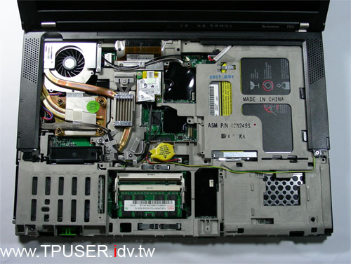 左圖是ThinkPad T61的內部構造,站長已經先把主要的元件位置標示出來。T61/R61的內部零件擺設與T60/R60相差無幾,當取下Palmrest與鍵盤之後,便可一賭主機內部全貌。以左圖的T61為例,最顯眼的莫過於蜿蜒於左上方的龐大銅質散熱片與溫控風扇,在其下方的CPU與晶片組容後詳述。