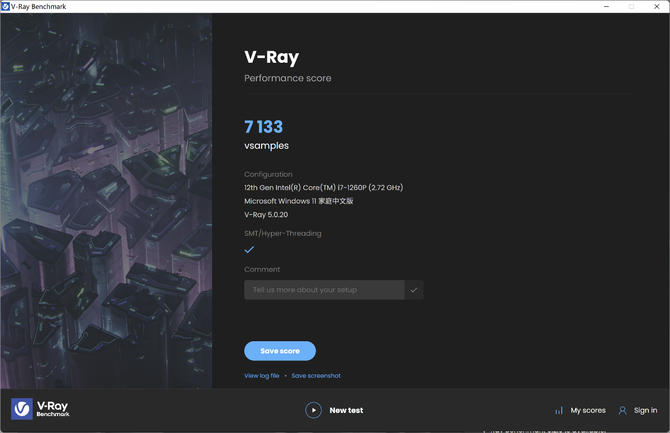 V-Ray Benchmark 是一款免费的独立的渲染速度测试软件,可以测试CPU、GPU,并通过智能打分用以评估硬件性能。结果可见,酷睿i7-1260P处理器的V-Ray渲染成绩为7133 vsamples,这意味着你可以用XPS 13 Plus运行3DMax、maya等制作软件。