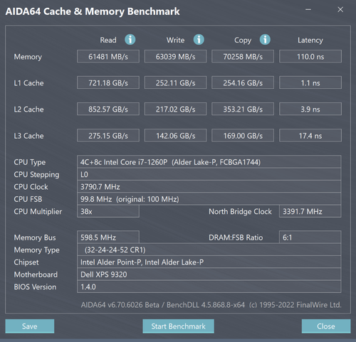 大容量、高频内存,有助于多任务处理的流畅,尤其是在运行大型创意软件加载多个素材时,既能保证速度,也提升了稳定性。这款XPS 13 Plus搭载了32GB LPDDR5 5200MHz内存,还保证了在未来数年的使用中,都不会因为内存不足而导致烦恼。我们使用AIDA64对内存进行测试,读取速度61481MB/s,写入速度63039MB/s,Copy的速度为70258MB/s,综合性能达到旗舰级别。