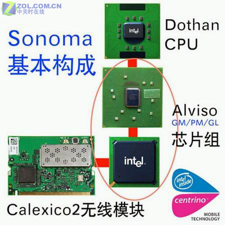 引:2005年1月19日,英特尔表示将正式发布第二代迅驰移动平台——Sonoma。简单的说,Sonoma由新一代Pentium M处理器(开发代号Dothan)、915M系列主板芯片组(搭配ICH5南桥)(开发代号为Alviso)和802.11b/g双频无线网卡(开发代号Calexico2,含2.4 GHz IEEE 802.11 a/b/g规格支援)三大部件组成。而其他诸如SATA接口硬盘、DDR2-533内存、Intel2200BG无线网卡也是这个平台的先进之处。