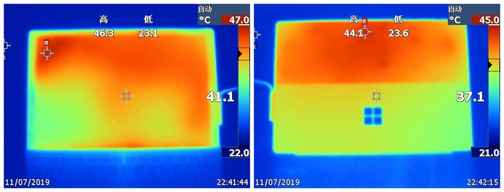 不过好在外壳的隔热表现尚可,烤机30分钟后,正面最高温度仅46.3℃,背面最高温度44.1℃,基本上不会出现烫手的情况。
