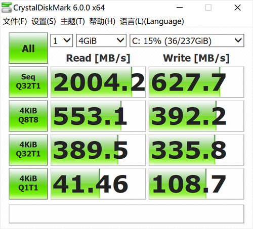相比Surface Pro6所使用的酷睿i5-8250U,性能提升还是比较明显的。多线程和单线程成绩均提升了约20%左右。 SSD性能测试