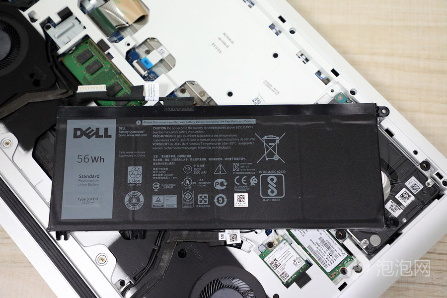我们依次拆下机身上的主要部件,首先要拆下的是这块容量为56Wh的电池,戴尔G7支持快速充电技术,在接通电源后可以快速充满电池,让电脑保持随时可以“战斗”的状态。