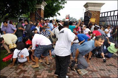 销售现场开门的时间是当地时间上午七点开门,但是有些人已经从凌晨一点半开始就等候在那里。当门一打开,整个人群已经不受控制。