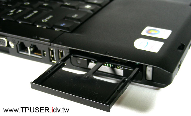 左圖是按下PC Card退出鈕的特寫。如果大家還有印象的話,T60 / R60的Express Card+ PC Card擴充槽擁有相同的防塵門與獨立兩個退出鈕,而T61 / R61也採取同樣的設計。站長沒想到T61 / R61在四合一讀卡機 + PC card的組合時,竟然在PC Card的部份改成用假卡(Dummy Card)來取代防塵門。呃...若哪天忘了裝回去,豈不是留個大洞在那邊?難不成可間接促進機體內部空氣流通嗎 (苦笑)。