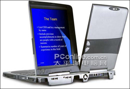该款机型设有2个液晶显示屏,并且还可以多显示桌面,也可以180度旋转,更可以作为一个大的屏幕使用,够奇特吧?液晶显示屏是采用2个1024×768点阵的13.3寸的TFT液晶屏,将两个显示屏加在一起可作为最大的1536×1024点阵的20寸液晶显示屏来利用了,这是人们对笔记本电脑的新尝试。然而,这台笔记本是作为一款概念机而推出的,尽管它有诡异的设计,不过接近6kg的重量和极其昂贵的价钱令它也紧紧局限于概念,可用性不强,因此它也并没有受到市场的肯定就烟消云散了,但我们从中也发现,笔记本已经开始走向了多元化。