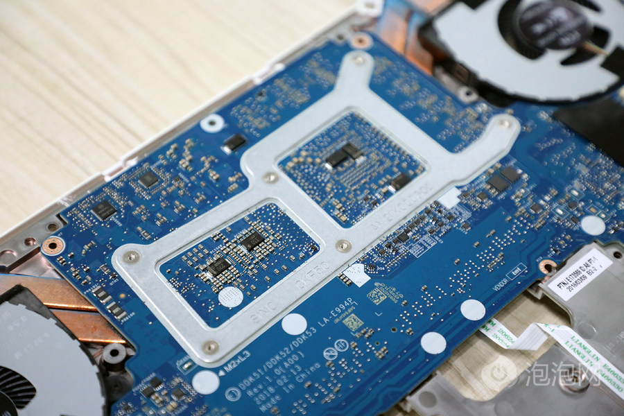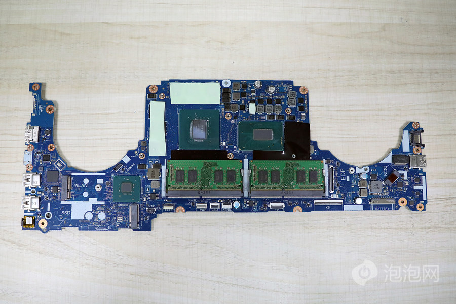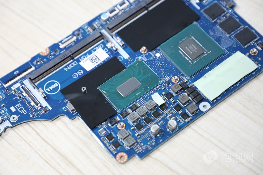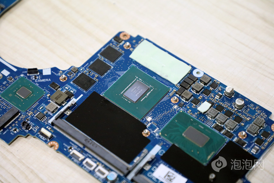 在内存上方的主板中心位置封装着NVIDIA GeForce GTX 1060 Max Q 6GB 显卡以及有着高性能的酷睿i7-8750H处理器。