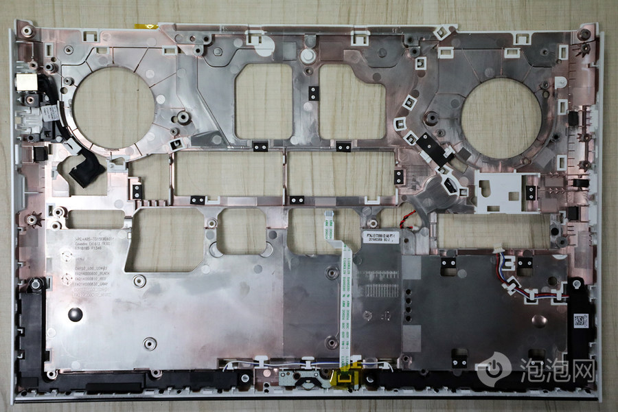 戴尔G7采用了类似于三明治的内部结构,其中在最顶面的C面上安装的是键盘与触摸板,主板、其他元器件以及散热模块被固定在了夹层中框,最后D面是快拆窗口,夹层中框与C面之间使用螺丝进行固定。