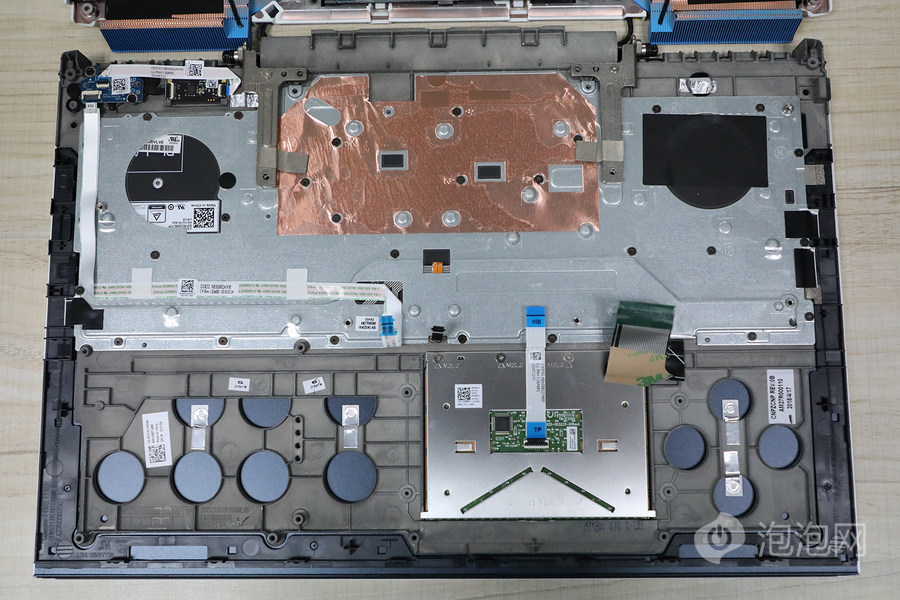 戴尔还为G7的散热模块在D面键盘下增加了一块铜箔导热片,将处理器和显卡全力运作产生的高温更快的向外导出,提高了散热性能。