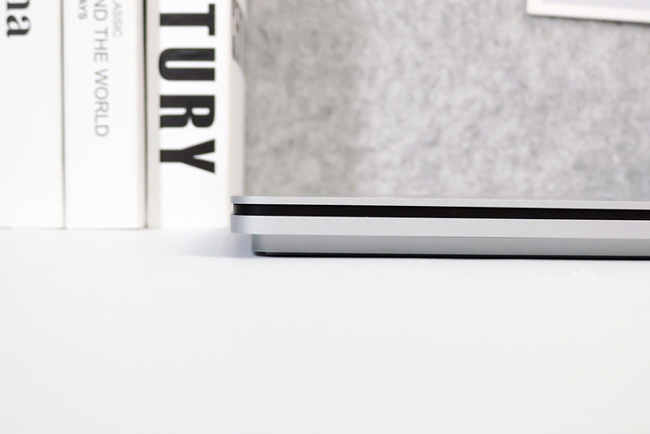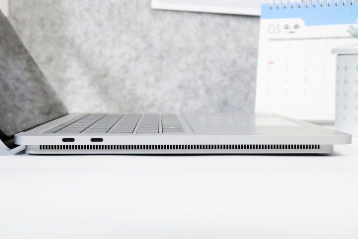 Surface Laptop Studio的散热孔在机身侧面,从侧面来看,Surface Laptop Studio是两段式设计,就像是把笔记本放在了一个台子上,这样设计从视觉上会让人感觉Surface Laptop Studio的机身更薄。