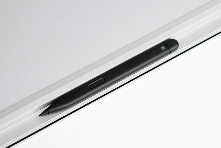 Surface Laptop Studio的两段式设计还可以将触控笔收纳进去,通过磁吸的方式,可以收纳Surface超薄触控笔2,并为其充电。磁吸较为牢固,方便用户将笔记本以及触控笔同时携带。