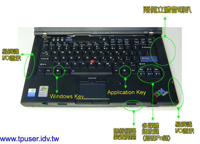 當使用者打開Z60-Series的LCD之後,如左圖所示,會發現與過去ThinkPad不同的幾個特點。Z60特地將Windows鍵與Application鍵加入ThinkPad傳統鍵盤中,習慣使用Windows鍵的使用者終於可以一嘗宿願了。Z60鍵盤右下方的方向鍵也特別賦予了多媒體程式撥放時常用的幾項功能(需配合「Fn」鍵使用)。