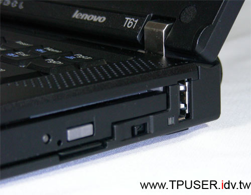 T61主機配備與T60相同數量的三個USB Port,其中兩個位於主機右側,第三個則是在主機右側的後面,這點設計與Z60t-Series相同。左圖裡面在Ultrabay Slim上方的則是右側喇叭。市面上有許多寬螢幕notebook都會使用兩側多出來的空間置放喇叭,在鍵盤尺寸並沒有調整的情況下,與其兩側空出來,不如善加利用。從左圖也不難想見,喇叭厚度有多薄了,雖然左右喇叭播放音樂時音量尚可,但音質就不忍苛責了。如果網友常需要透過T61 / R61播放音樂,比較好的選擇還是使用外接式的喇叭。