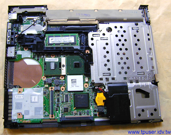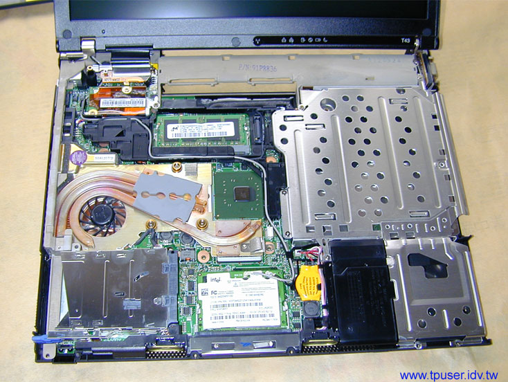 接下來幾張圖片是帶大家一覽ThinkPad T43內部構造。有關T40-Series各部功能在先前的ThinkPad T40介紹特集中已經有詳細的介紹,站長便不贅述了。僅就幾處變化較大的地方向各位說明。