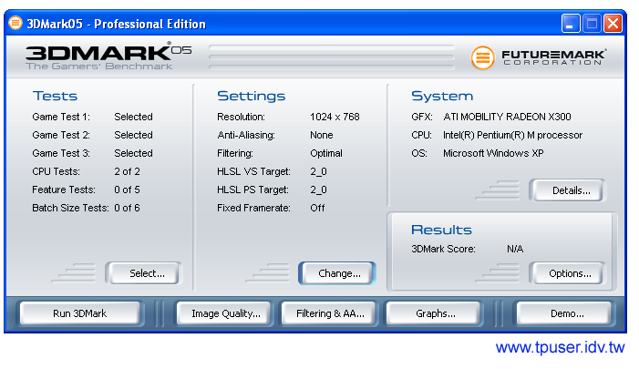 最後不免俗地將ThinkPad T43的各項測試數據與網友分享。站長所借測的這台T43是採用ATI Mobility Radeon X300獨立顯示晶片的機種,由於採用的是Alviso平台,因此配備的是支援533MHz的Pentium-M (Dothan)處理器。此台使用的是1.86GHz時脈的CPU。有關CPU的規格請參閱左圖。