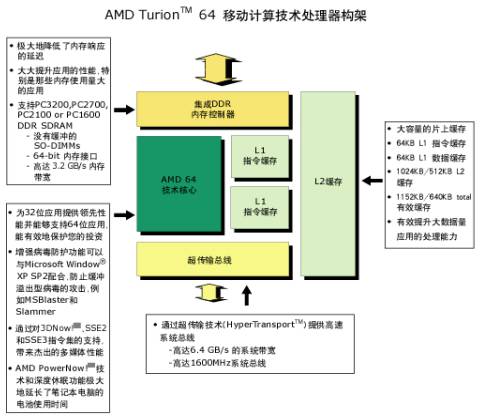 与以往将笔记本处理器混杂在台式处理器的低调做法相比,AMD此次在轻薄笔记本市场高调出击,推出了一个全新的子品牌Turion 64。据说,Turion一词取自Tour,有“行动”之意。“自由、强大、开放”,是Turion 64的品牌内涵,“自由”主要来自轻薄、无线上网、功耗低等因素;强大主要源于AMD64位及超传输技术总线及集成内存控制器构架;开放则让OEM厂商可以为最终客户提供差异化的移动上网功能。