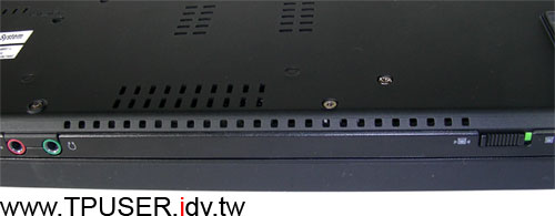 T61主機配備與T60相同數量的三個USB Port,其中兩個位於主機右側,第三個則是在主機右側的後面,這點設計與Z60t-Series相同。左圖裡面在Ultrabay Slim上方的則是右側喇叭。市面上有許多寬螢幕notebook都會使用兩側多出來的空間置放喇叭,在鍵盤尺寸並沒有調整的情況下,與其兩側空出來,不如善加利用。從左圖也不難想見,喇叭厚度有多薄了,雖然左右喇叭播放音樂時音量尚可,但音質就不忍苛責了。如果網友常需要透過T61 / R61播放音樂,比較好的選擇還是使用外接式的喇叭。
