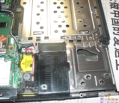 特别说明一下:如果卸载了触摸板驱动的话,需要重新按一个trackpoint的驱动,T42或以前的机子如果更换指纹掌托,在主板支持的情况下,还要注意硬盘架子那里,见上图,有的需要更换硬盘架子。