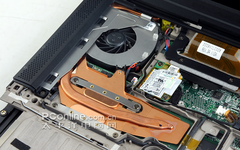 而且miniPCI插槽很小且具备两个小miniPCI,另外还可以扩展蓝牙模块的选件,或者以后Lenovo会针对Z60推出一些甚至这种小miniPCI接口的选件,供不同需求用户进行升级与功能延伸。因为这样位置的变化,散热模块也进行了全面的修改,出风口位置移到了左侧面与后端。