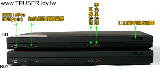 左圖是T61與R61的正面照,如果不去細看LCD右下方的機種名稱,可能會分辨不出兩款的差異。簡言之,單就外觀上而言R61比T61厚,裝配4- CELL電池時,兩主機的長度與寬度都相同(335mm x 237mm),差別在於厚度;T61的厚度為27.6~31.9mm,R61則為30.6~34.9mm。第二項差異,則是重量;T61 (4-CELL) 的重量為2.3公斤,R61 (4-CELL)則是2.4公斤,差距已不大。