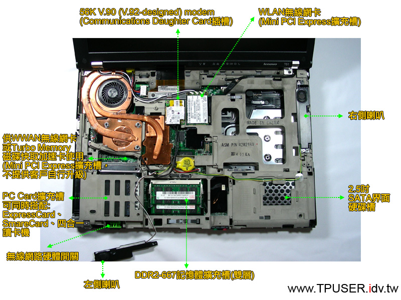 左圖是ThinkPad T61的內部構造,站長已經先把主要的元件位置標示出來。T61/R61的內部零件擺設與T60/R60相差無幾,當取下Palmrest與鍵盤之後,便可一賭主機內部全貌。以左圖的T61為例,最顯眼的莫過於蜿蜒於左上方的龐大銅質散熱片與溫控風扇,在其下方的CPU與晶片組容後詳述。