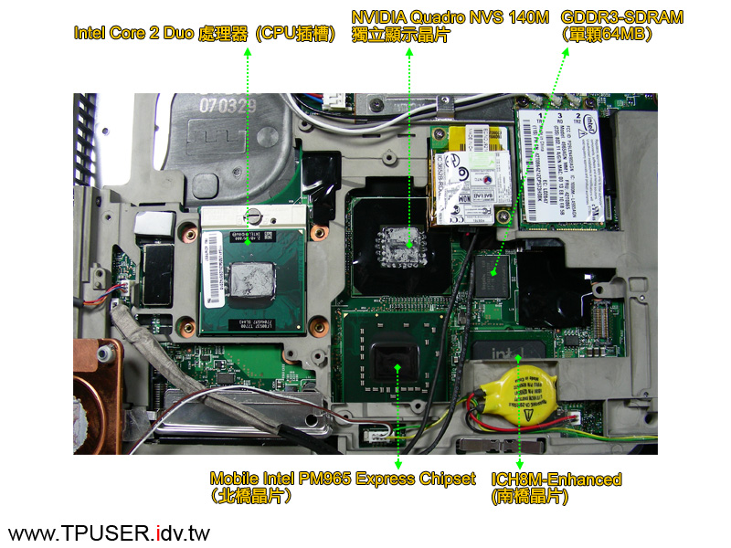 將風扇與散熱片取下後就能看到T61的心臟部位,如左圖所示,站長已經把重要的元件標示出來。T61/R61所使用的Intel Core 2 Duo處理器屬於「Santa Rosa」世代,雖然研發代號仍舊為「Merom」,但與「Napa Reflash」世代所使用的Merom在腳位定義上(Socket-P)不同,簡單講就是T61/R61所使用的Core 2 Duo處理器無法拿到T60/R60上面使用(Socket-M),會插不進去,反之亦然。
