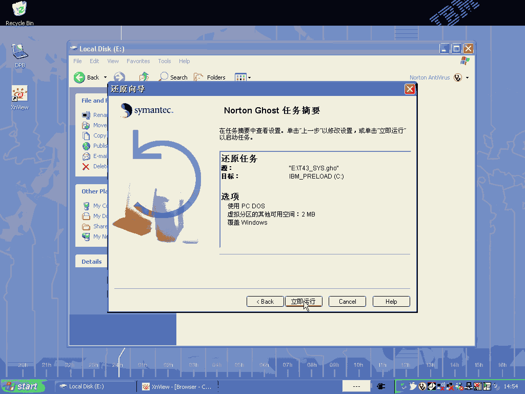 首先系统要安装过Norton Ghost 2003这个软件(ftp有下载),并且我们的硬盘上要有ghost文件(一般很大,G的量级)。