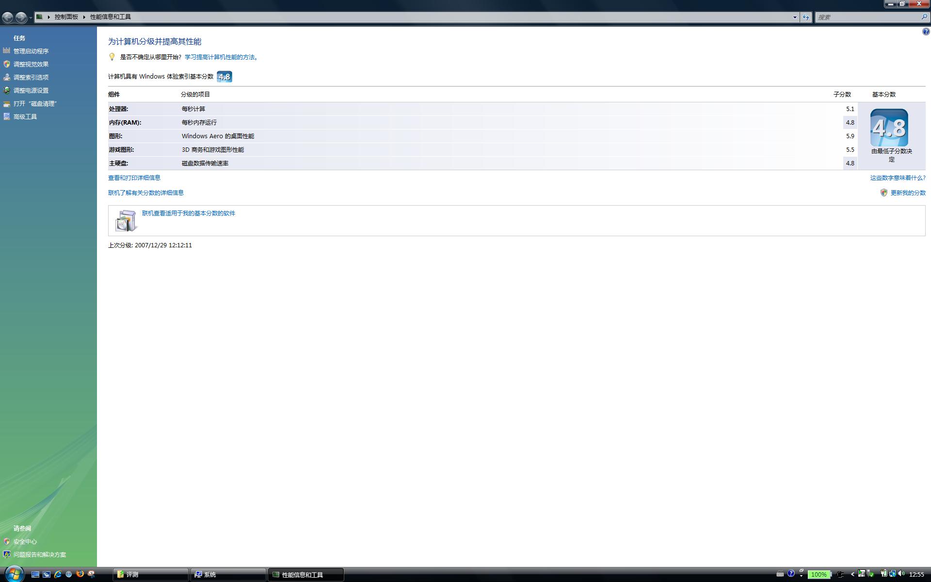 先看看在各自的两个系统下的Vista评分,如图,除了硬盘选项之外,没有差别,硬盘的差别较大,使用7k200的系统,硬盘得分为5.4,而使用5k160的系统,硬盘得分只有4.8