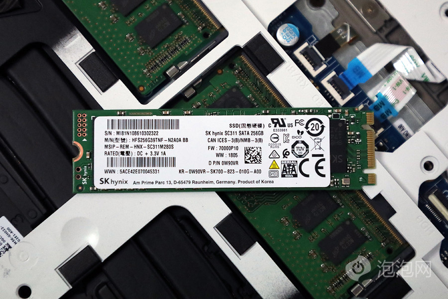 接下来被拆下的是这块来自海力士的M.2(SATA)固态硬盘,有着256GB容量,满足用户高速存储的需求,为用户带来更快的启动速度。