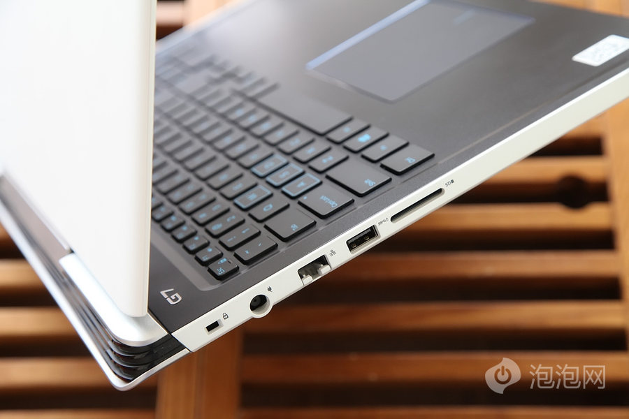 戴尔G7游戏本在外观的设计上非常值得称赞,笔记本后方通常为散热系统的出风口区域,这款笔记本在出风口区域增加了蓝色格栅,与A面logo与C面面板相互呼应,另外,在后方的左下方,还配有“G7”的金属名牌,提升辨识度。
