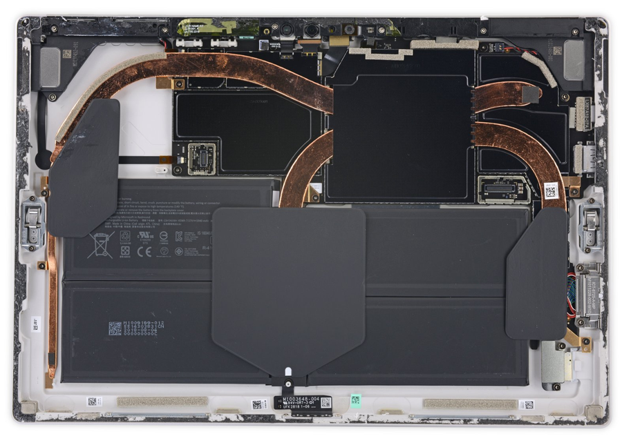 同上一代相同,i5 版的 Surface Pro 6 也采用了无风扇设计,而 i7 版本则配备了一枚风扇,从 iFixit 的拆解来看,Surface Pro 6 以 CPU 为中心,设置了两根非常宽的导热铜管,铜管延伸的面积非常大,在铜管的末端还设置了散热垫,承载了机身内所有发热大户的散热任务。我们使用 AIDA64 中的系统稳定性测试工具将 Surface Pro 6 的 CPU、GPU、内存、硬盘等组件满载运行半个小时后使用热成像仪进行检测。