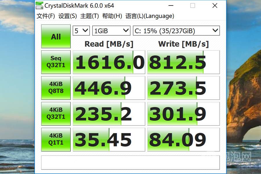 我们手中的这台 Surface Pro 6 配备了一块来自海力士的 256GB PCIe 固态硬盘,使用 Crystal DiskMark 软件进行测试,其拥有 1616MB/S 的读取速度和 812MB/S 的写入速度,性能表现不错。