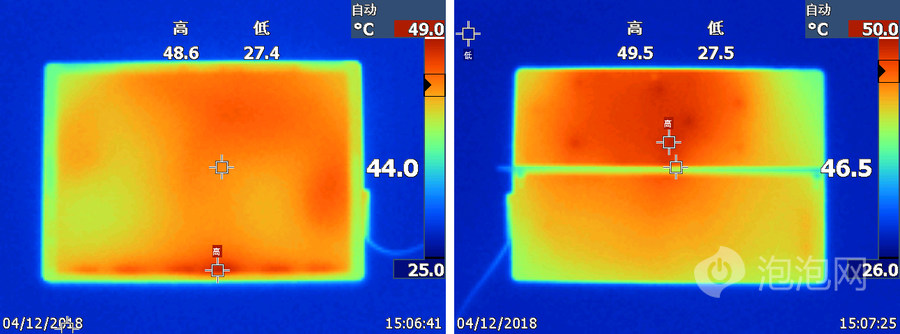 在屏幕正面,Surface Pro 6 的热量呈现出均匀分布的状态,最高温度 48.6 度,平均温度 44 度。屏幕背面的最高温度则为 49.5 度,平均温度 46.5 度,热量基本上是平均分布的,高温主要聚集在后置摄像头附近。