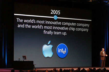据透露,2006年苹果转向Intel后推出的首款机型将采用Pentium M处理器。苹果和Intel的发言人都没有对此发表任何评论。很难令人想象,早在五年前,苹果CEO Steve Jobs就已经在安排转向使用Intel芯片的计划了;但Jobs当时也仅把它看作是应急计划,用以应对与IBM以及Freescale半导体合作出现困难时的局面。但事实确实发生了,苹果与IBM、Freescale发生了分歧,当年的后备计划成为了本周业界的焦点。在本周一美国旧金山举行的WWDC 2005会上,Jobs在发言中证实了明年苹果电脑将使用Intel处理器,结束了过去数周以来的种种猜测。