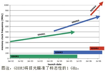 随着人们对现代台式机和笔记本电脑的处理器和系统内存的要求日益严格,对图形控制器和显存的性能要求也越来越高。在这种发展趋势下,系统内存从DDR1(双数据率)SDRAM升级到了DDR2 SDRAM。在显存领域,也在进行同样的升级换代——在高端领域,GDDR1向GDDR3转换几近完成,GDDR3继承了GDDR2中实现的新功能;在主流显存领域,x16DDR1正在向x16DDR2转换。与GDDR1相比,新的GDDR3图形标准大幅提升了系统的图形性能,可满足高端独立式图形系统市场的需求。