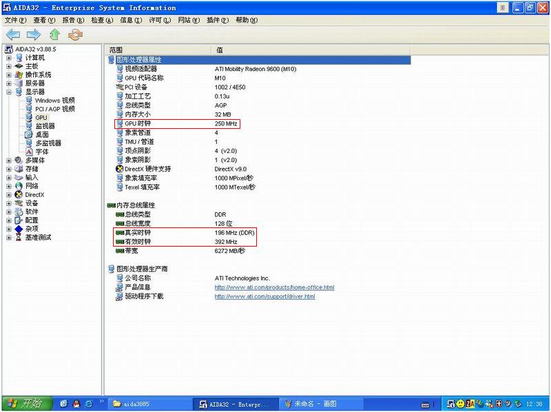 可以说,偶对NC6000的显卡有了比较深入的认识,ATI公布的9600的频率应该为:350MHZ-GPU(图形处理器核心工作频率),300MHZ-显存(DDR 600MHZ),而NC6000的9600是缩水版的,GPU为250MHZ,显存为200MHZ,分别降了100MHZ