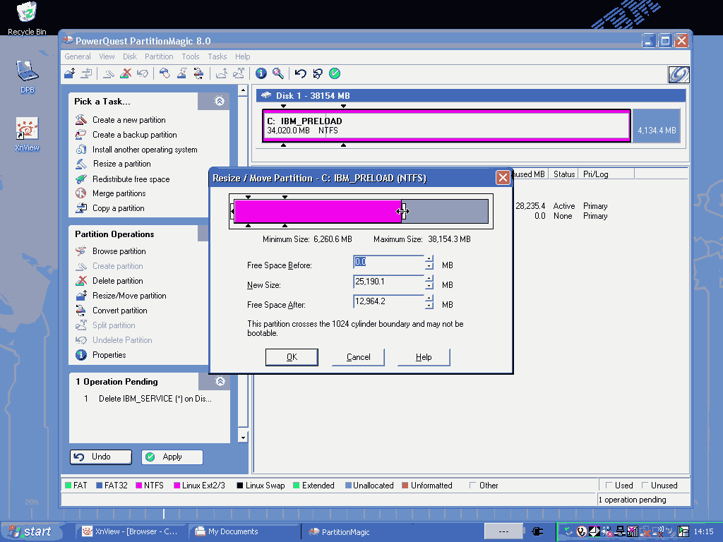 IBM系列机型官方都不提供安装光盘,而用硬盘上一个隐藏分区来恢复系统,名曰一键恢复技术。客观来讲,用隐藏分区的好处是操作简单、不需要临时找光盘,缺点就是时间太长(干等2hr)、恢复出的系统太乱(好多乱七八糟的软件)、而且占用很大一块硬盘空间。在我们有了光盘或者系统镜像ghost的情况下隐藏分区变得不是那么必要,所以可以将其删除。下面我来介绍如何用PowerQuest PatitionMagic 8.0(简称PQ Magic,PQ)来删除隐藏分区和对硬盘进行分区操作。