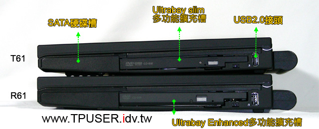 第四個T61/R61外觀上的差異點是位於主機右側的Ultrabay擴充槽。T61採用9.5mm高的Ultrabay Slim;R61則是12.5mm高的Ultrabay Enhanced。絕大多數的Ultrabay Slim周邊都能裝入Ultrabay Enhanced擴充槽,舉凡: