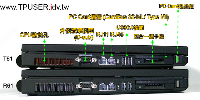 左圖是T61與R61的正面照,如果不去細看LCD右下方的機種名稱,可能會分辨不出兩款的差異。簡言之,單就外觀上而言R61比T61厚,裝配4- CELL電池時,兩主機的長度與寬度都相同(335mm x 237mm),差別在於厚度;T61的厚度為27.6~31.9mm,R61則為30.6~34.9mm。第二項差異,則是重量;T61 (4-CELL) 的重量為2.3公斤,R61 (4-CELL)則是2.4公斤,差距已不大。