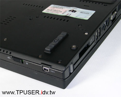T61主機配備與T60相同數量的三個USB Port,其中兩個位於主機右側,第三個則是在主機右側的後面,這點設計與Z60t-Series相同。左圖裡面在Ultrabay Slim上方的則是右側喇叭。市面上有許多寬螢幕notebook都會使用兩側多出來的空間置放喇叭,在鍵盤尺寸並沒有調整的情況下,與其兩側空出來,不如善加利用。從左圖也不難想見,喇叭厚度有多薄了,雖然左右喇叭播放音樂時音量尚可,但音質就不忍苛責了。如果網友常需要透過T61 / R61播放音樂,比較好的選擇還是使用外接式的喇叭。